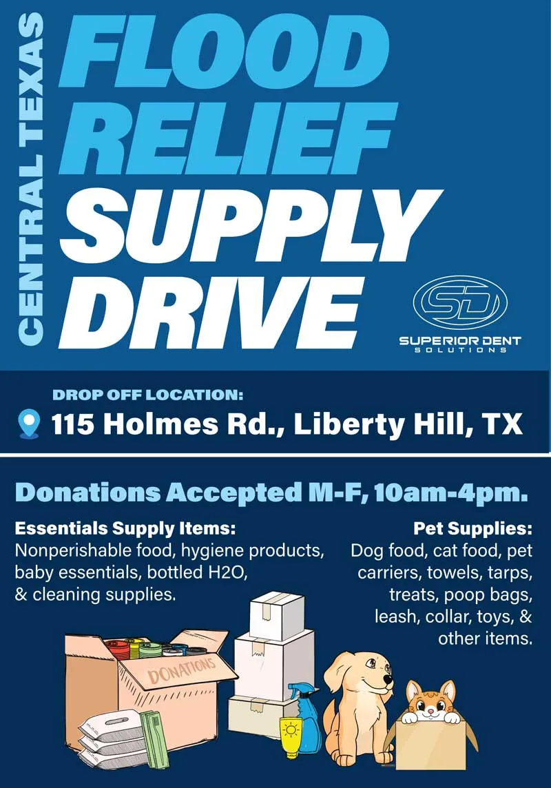 July-September 2025 – Superior Dent Solutions will donate $100 to Central Texas Community Foundation to support victims of the July 5, 2025 floods in Williamson County.